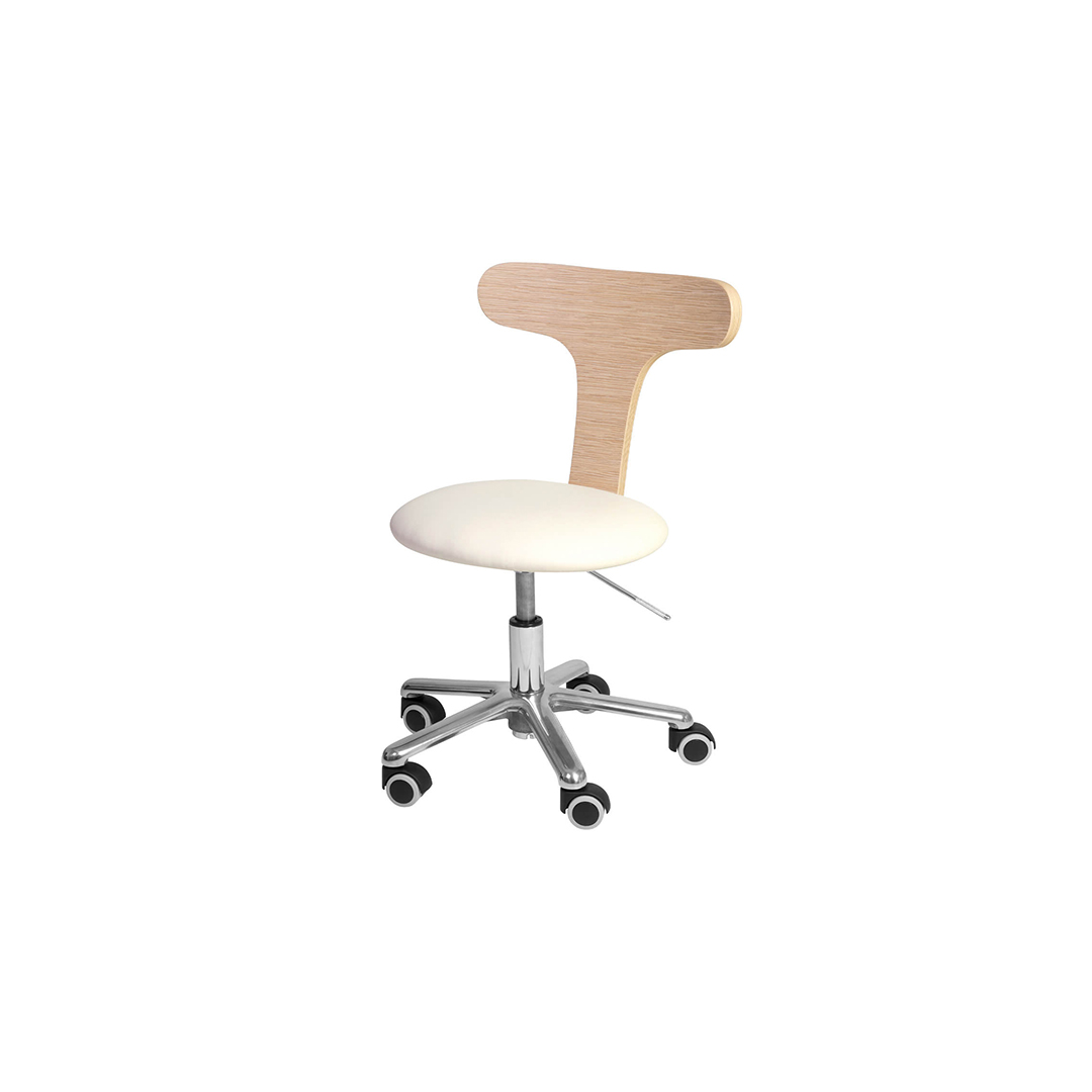 Сиденье стула оборудовано пневматическим газовым подъемником, который позволяет регулировать высоту в диапазоне до 40 см. Эргономичное мягкое сидение с наполнителем из натуральной сои обеспечивает исключительный комфорт мастеру в течение рабочего дня. Изогнутая спинка, изготовленная из многослойного лакированного дерева, добавляет элегантности и поддержки.