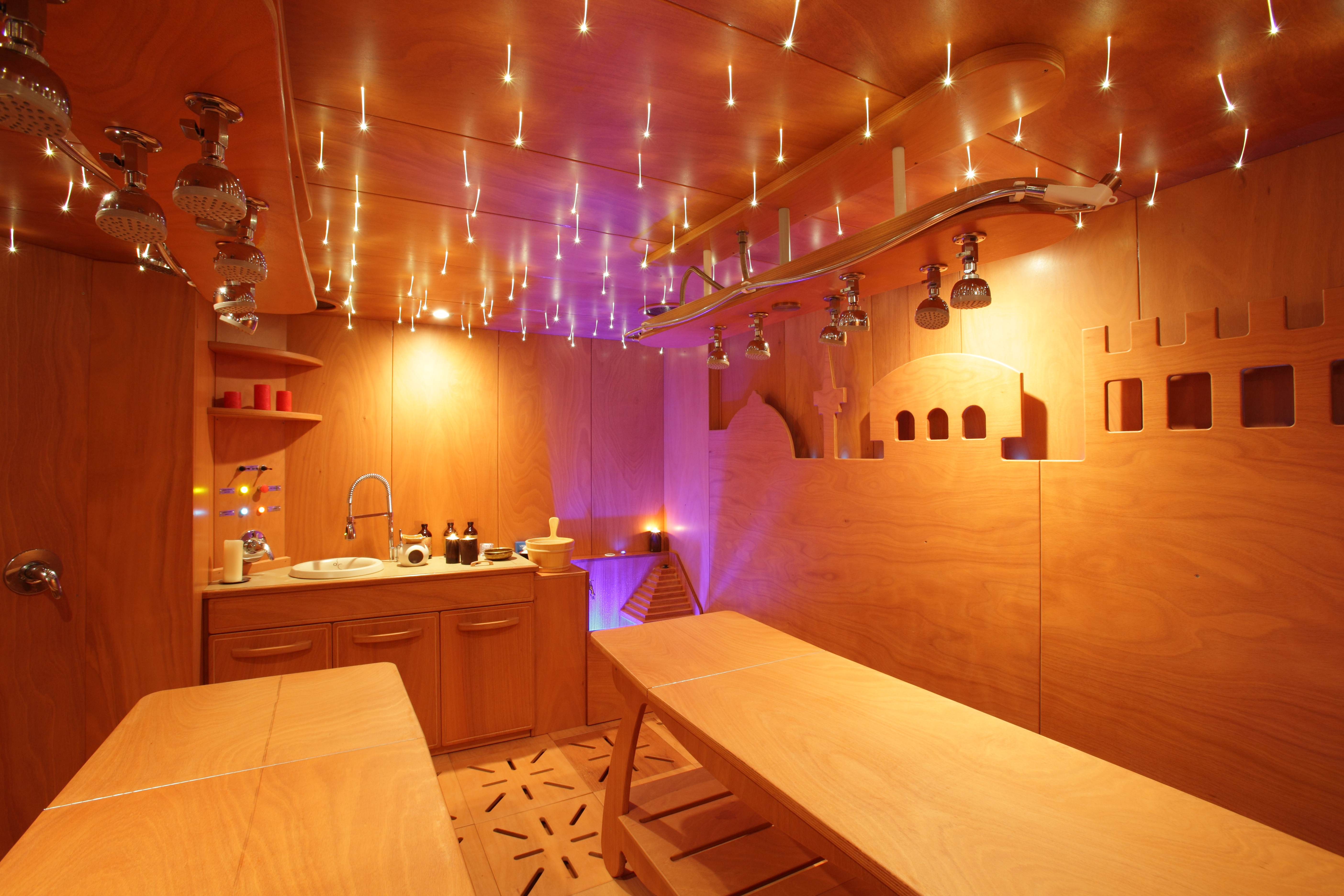 Внутреннее оснащение: хромотерапия – потолочная и настенная, аффузионный душ (душ Виши), тропический душ, лаборатория из дерева со встроенным электронагревателем для грязей с термостатом, встроенные складные боковые скамейки, декоративный водопад, аюрведическая кушетка.